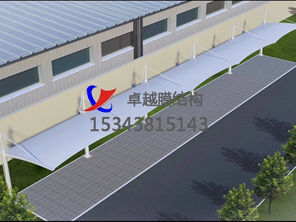 膜結構車棚PVC材料的主要特點是強度低、彈性大、易老化、徐變大、自潔性差,但價格便宜,容易加工制作,色彩豐富,抗折疊性能好。為改善其性能,可在膜結構車棚表面涂一e799bee5baa6e997aee7ad94e4b893e5b19e31333433626562層聚四氟乙烯涂層,提高其抗老化和自潔能力,其壽命可達到15年左右。
