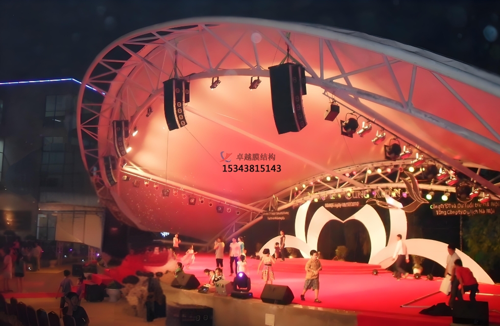 在設(shè)計(jì)膜結(jié)構(gòu)舞臺(tái)時(shí),首要任務(wù)是深入理解演出主題與風(fēng)格。從色彩、造型到整體氛圍營造,都應(yīng)圍繞主題展開。若是一場(chǎng)古典音樂會(huì),膜結(jié)構(gòu)舞臺(tái)可采用簡潔、優(yōu)雅的白色調(diào),搭配流暢的線條,營造出莊重、典雅的氛圍;而對(duì)于現(xiàn)代藝術(shù)展的舞臺(tái),則可以運(yùn)用大膽的色彩和前衛(wèi)的造型,展現(xiàn)出創(chuàng)新與活力。通過精準(zhǔn)的設(shè)計(jì),膜結(jié)構(gòu)舞臺(tái)成為演出主題的視覺延伸,強(qiáng)化藝術(shù)表達(dá)。