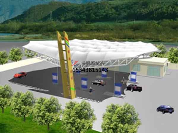 更后加氣站雨棚施工是由多種高強(qiáng)薄膜材料(PVC或Teflon)及加強(qiáng)構(gòu)件(鋼架、鋼柱或鋼索)通過一定方式使其內(nèi)部產(chǎn)生一定的預(yù)張應(yīng)力以形成某種空間形狀,作為覆蓋結(jié)構(gòu),并能承受一定的外荷載作用的一種空間結(jié)構(gòu)形式。結(jié)構(gòu)車棚的篷布材質(zhì)是膜結(jié)構(gòu),而膜材的更大特點(diǎn)是強(qiáng)度高、耐久性好、防火難燃、自潔性好,不受紫外線影響,使用壽命長,一般15-30年。具有高透光率,透光率為13%,對熱能反射率73%,熱吸收量很少。正是因?yàn)檫@種劃時(shí)代的膜材料的發(fā)明,使加氣站雨棚施工成為現(xiàn)代化的永久建筑。