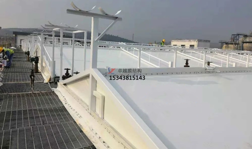 污水處理池加蓋,也稱反吊膜封閉,與常規(guī)建筑膜結構不同之處在于,鋼構在外部做支撐結構,膜材安裝在內部做防護密閉,此類膜材采用污水池專用材料,具有防腐蝕、抗老化、免維護、美觀耐久、經(jīng)濟適用等優(yōu)點。