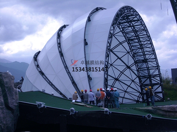 膜結(jié)構(gòu)在設(shè)計與施工方面有諸多要點。首先是設(shè)計關(guān)鍵環(huán)節(jié),其中包含力學分析,通過有限元軟件(如ANSYS)計算膜面張力分布,確保荷載下不產(chǎn)生褶皺或撕裂;找形設(shè)計,根據(jù)建筑造型需求,確定膜面初始形態(tài)(如馬鞍形、雙曲面),需兼顧受力合理性;剪裁設(shè)計是將三維膜面展開為二維裁剪片,考慮材料熱脹冷縮及張拉后的變形量(誤差需控制在1%以內(nèi))。然后是施工流程方面,其中包含基礎(chǔ)與支架安裝,也就是澆筑混凝土基礎(chǔ),安裝鋼結(jié)構(gòu)骨架或索網(wǎng);膜材的加工,其是在工廠按裁剪圖焊接膜片(熱熔焊接或高頻焊接),進行水密性測試;現(xiàn)場張拉是將膜材吊裝到位,通過鋼索或千斤頂逐步張拉至設(shè)計預應力值;細節(jié)處理是密封邊緣接縫,安裝排水槽、檢修通道等附屬設(shè)施。最后必須要兼顧的是安全與技術(shù)難點,需考慮風荷載下的膜面振動(如設(shè)置減震裝置),還有防火要求,膜材需達到B1級以上防火標準(如PTFE膜材為不燃材料)。