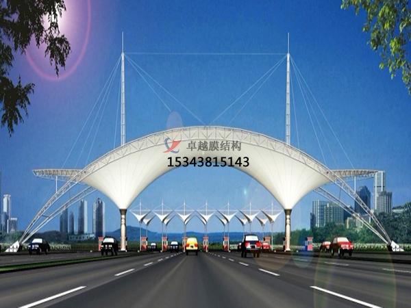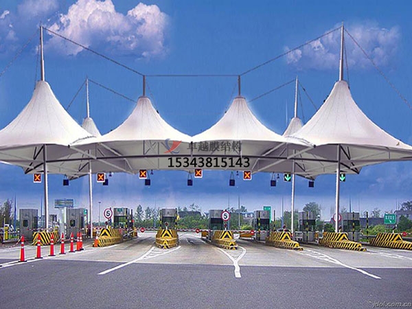 收費(fèi)站膜結(jié)構(gòu)是采用高強(qiáng)度柔性薄膜材料與支撐體系(如鋼架、鋼索)結(jié)合形成的空間張力結(jié)構(gòu),廣泛應(yīng)用于高速公路收費(fèi)站頂棚。其核心優(yōu)勢在于輕量化、造型自由及功能集成性。以下是關(guān)于收費(fèi)站膜結(jié)構(gòu)的詳細(xì)介紹: