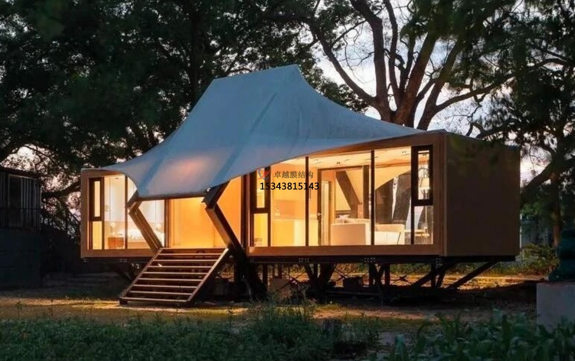 膜結(jié)構(gòu)景觀以其獨特的外觀和多樣化的功能而備受關(guān)注。膜結(jié)構(gòu)景觀不僅在建筑物上創(chuàng)造出令人印象深刻的視覺效果,同時還具有良好的抗風、防水、強度高、耐候性好,防火阻燃、自潔性好,并且不受紫外光線的影響,使用壽命在20年以上。