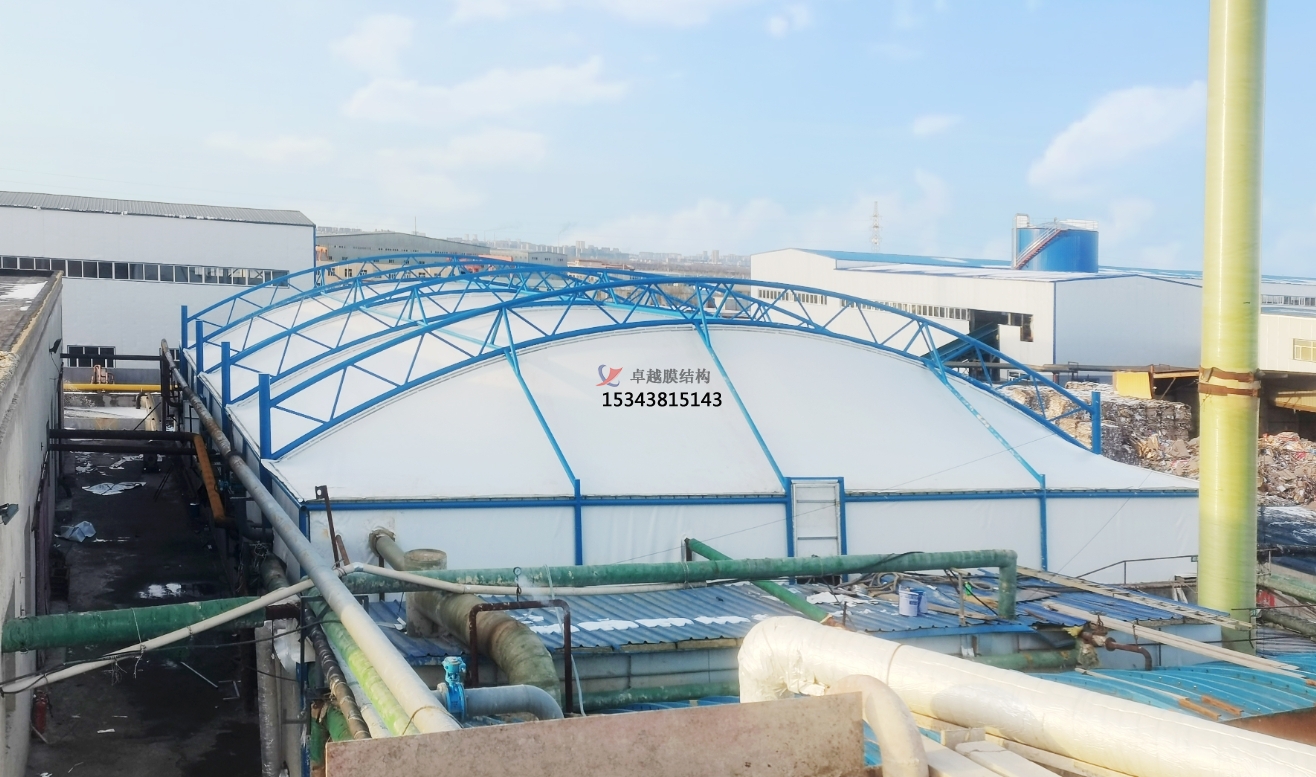 污水池反吊膜,顧名思義,是一種將薄膜材料以反吊的方式覆蓋在污水池上方的結構。這種結構通過鋼架或索網等支撐體系,將膜材料緊繃并固定于污水池上方,形成一個密閉或半密閉的空間,有效隔絕污水池內的惡臭氣體和有害物質,防止其對外擴散,同時保護膜材料免受污水池內腐蝕性氣體的侵蝕。